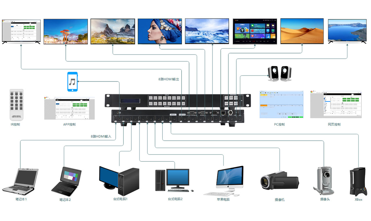 APP/Web控制型4K60 HDMI-88矩阵(带EDID控制)可连接8路HDMI信号源到8个显示器,主机有8个输入都支持音频加嵌,8路HDMI输出,且每一路HDMI输出都支持1080p到4K的全高清格式和音频解嵌,以及所有的3D格式。支持独立的EDID控制。HDMI-88主机可连接到HDMI显示器的蓝光播放机、数字机顶盒、家庭影院电脑以及游戏控制器搭配使用。通过提供的IR遥控装置、RS-232和TCP/IP,或者通过前面板的选择按键来选择,任何信号源在任何时候、任何显示器上都可以被识别。