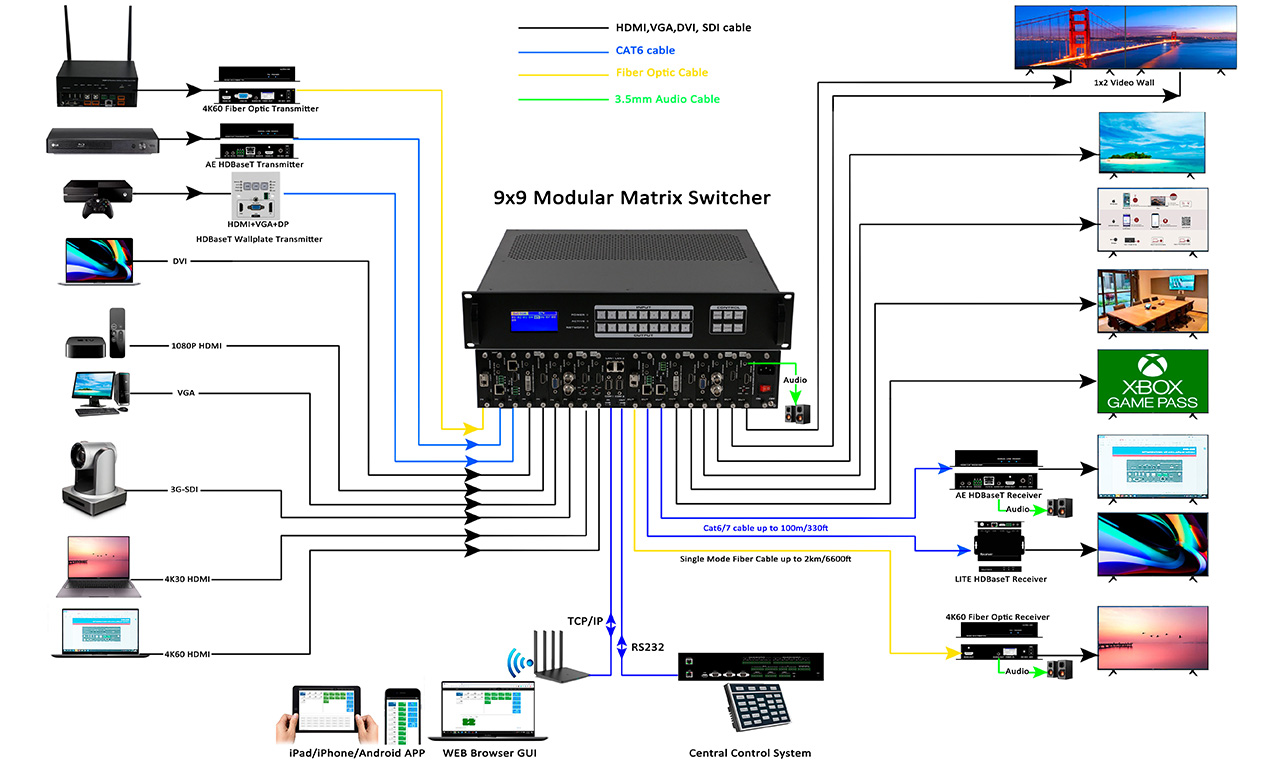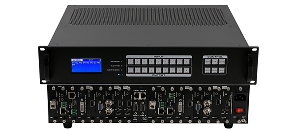 Ø模块化设计,设备采用单卡单路设计,可支持CVBS/VGA/YPBPR/DVI/HDMI/HDSDI/3GSDI/ HDBaseT/Fiber信号的混合输入和混合输出(其中VGA/YPBPR/CVBS采用DVI- I接口加转接头 的方式) ;