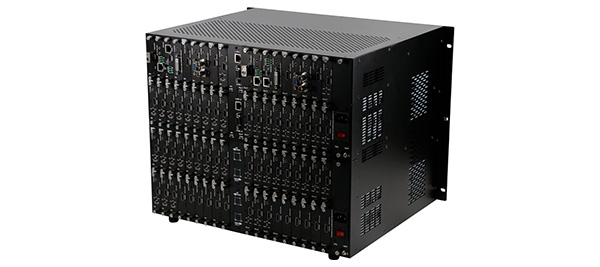 Ø模块化设计,设备采用单卡单路设计,可支持CVBS/VGA/YPBPR/DVI/HDMI/HDSDI/3GSDI/ HDBaseT/Fiber信号的混合输入和混合输 出(其中VGA/YPBPR/CVBS采用DVI- I接口加转接头 的方式) ;