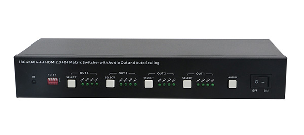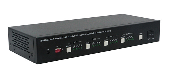 4K60 HDMI-44矩阵(带EDID控制)可连接4路HDMI信号源到4个显示器。主机有4路HDMI输出,且每一路HDMI输出都支持1080p到4K的全高清格式,以及所有的3D格式。支持独立的EDID控制。4K60 HDMI-44主机可连接到HDMI显示器的蓝光播放机、数字机顶盒、家庭影院电脑以及游戏控制器搭配使用。通过提供的IR遥控装置、RS-232,或者通过前面板的选择按键来选择,任何信号源在任何时候、任何显示器上都可以被识别。支持音频加嵌和解嵌,且每一路输出都可以单独切换不同的音频输出,不接入信号源的时候,无法切换信道,保持最后一次输出时的信道