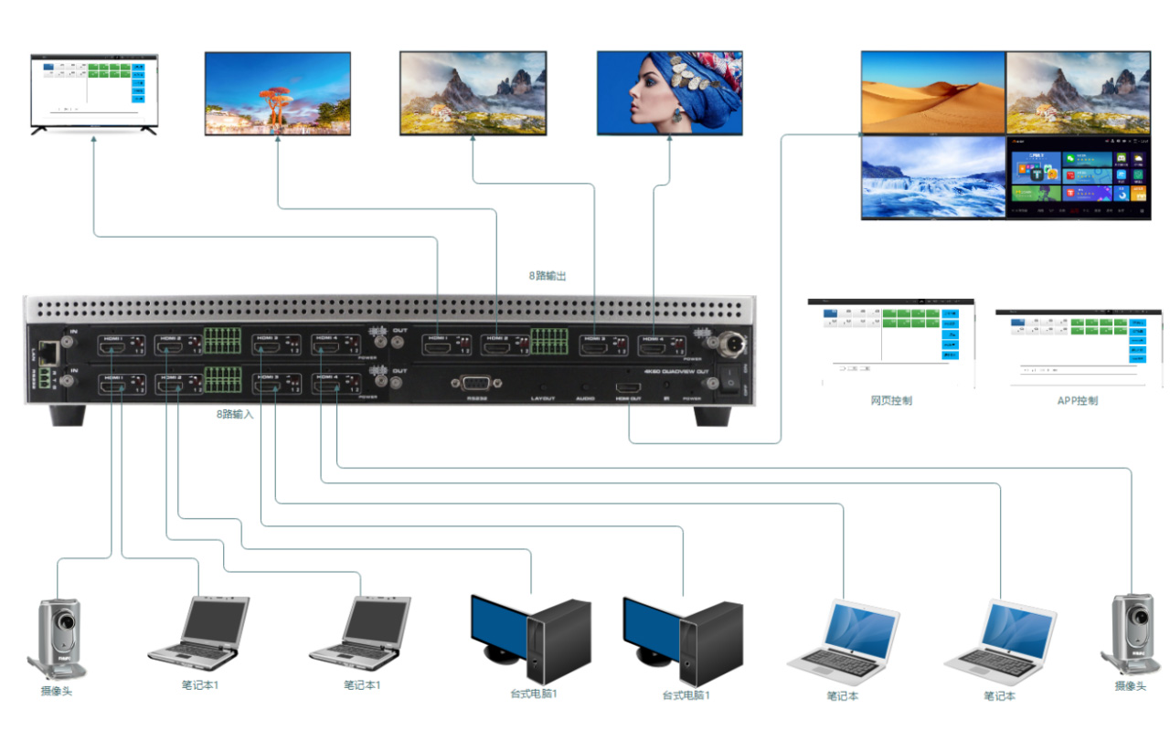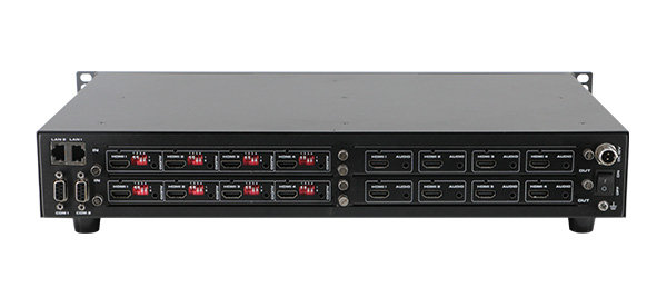 模块化设计,设备采用一卡四路设计,可支持 CVBS/VGA/YPBPR/DVI/HDMI/HDSDI/3GSDI/ HDBaseT/Fiber 信号的混合输入和混合输出;