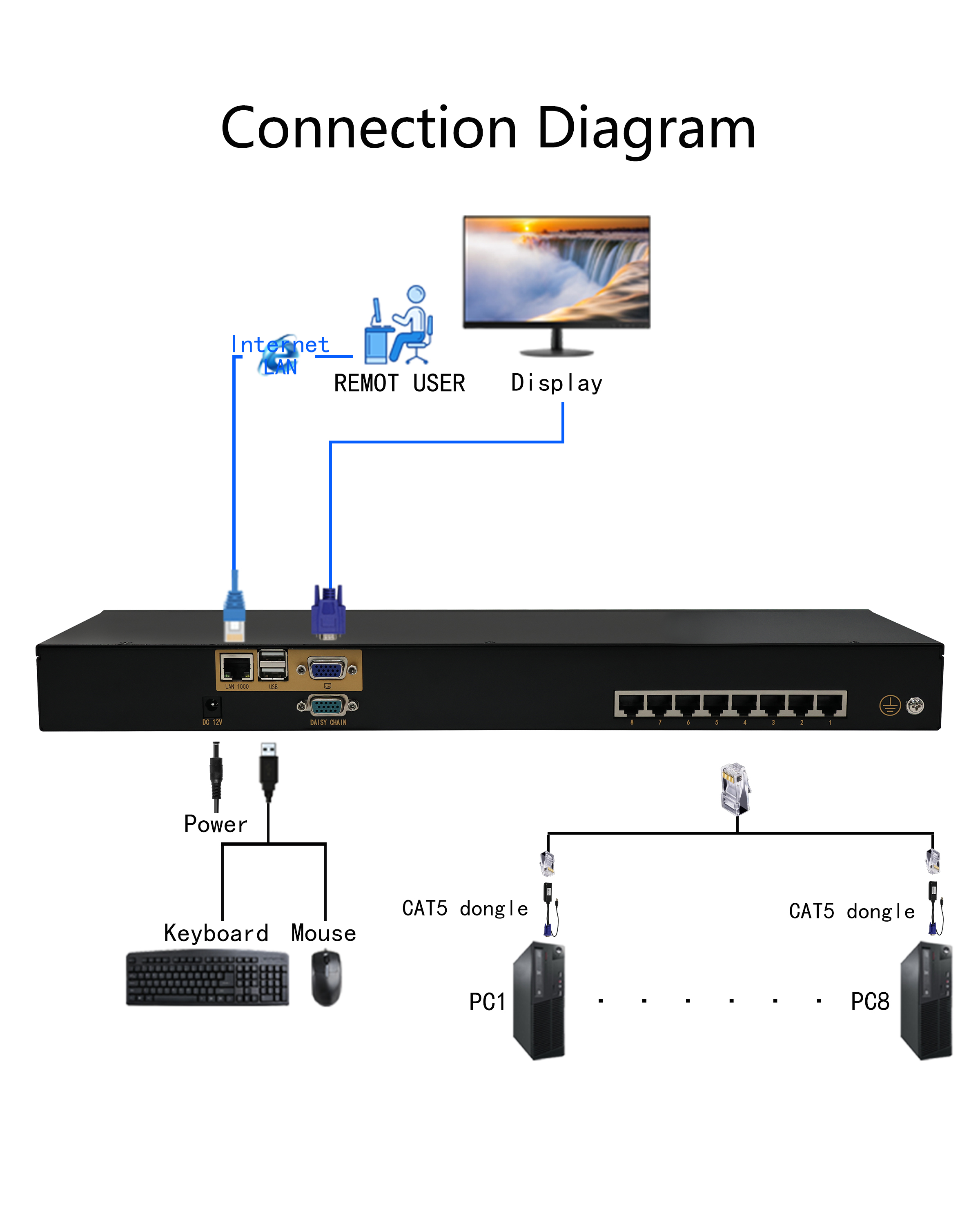 8台电脑, KVM菊链,级联2种链接可达2000多台电脑 |