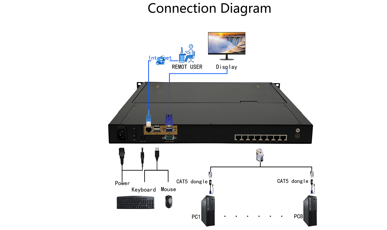 8台电脑, KVM菊链,级联2种链接可达2000多台电脑 |