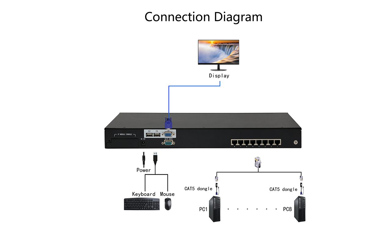 8台电脑, KVM菊链,级联2种链接可达2000多台电脑 |