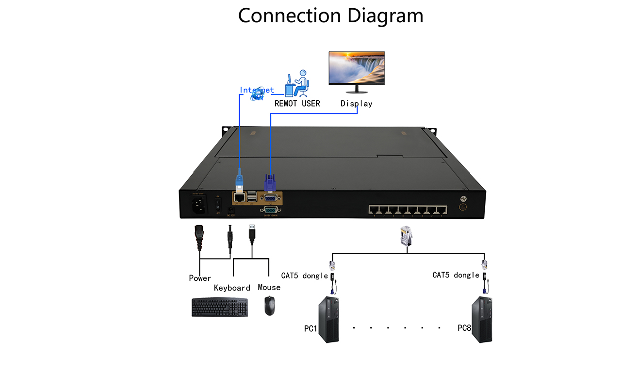 8台电脑, KVM菊链,级联2种链接可达2000多台电脑 |